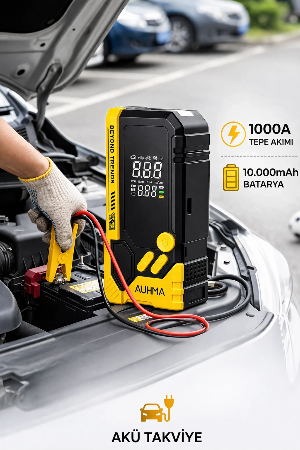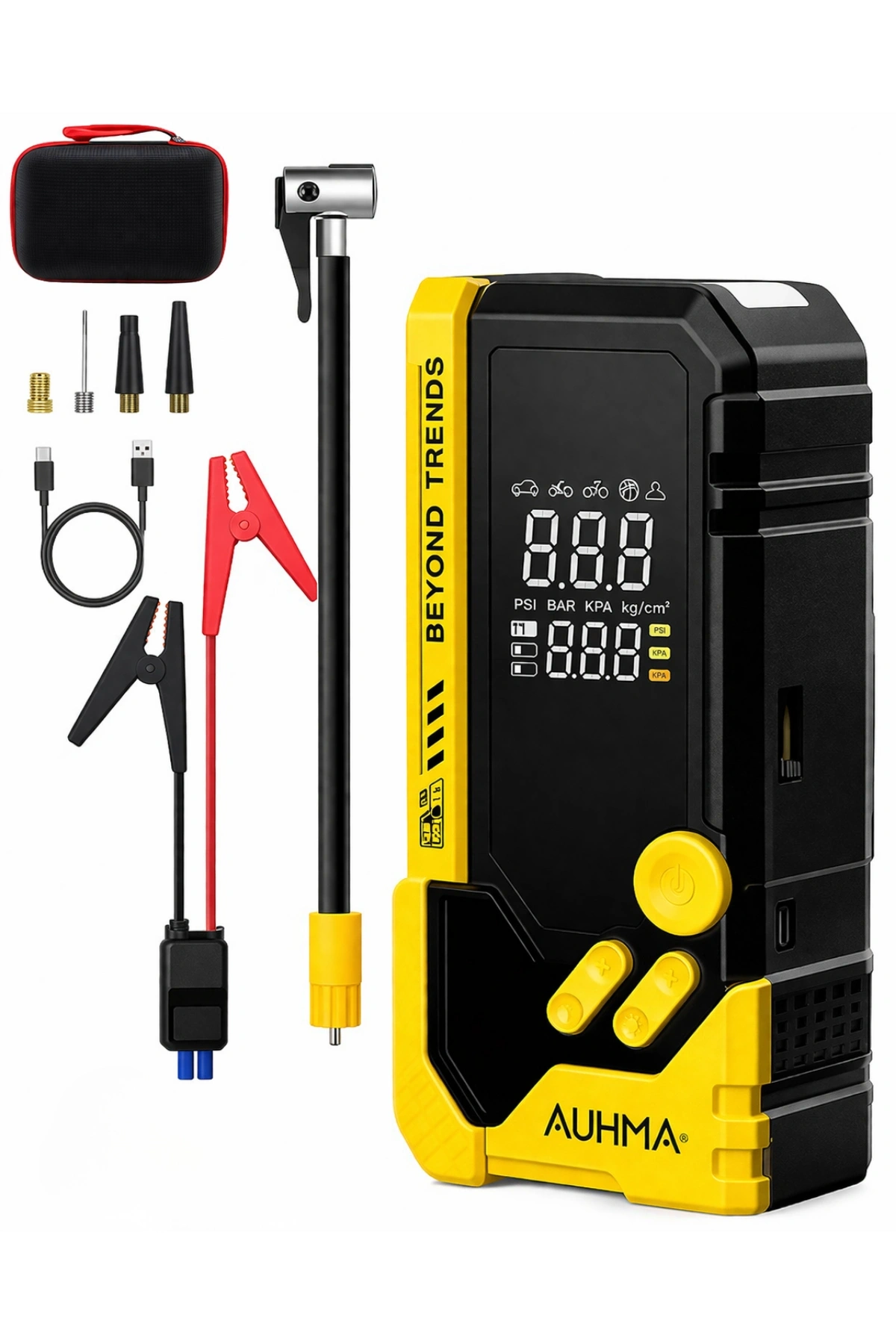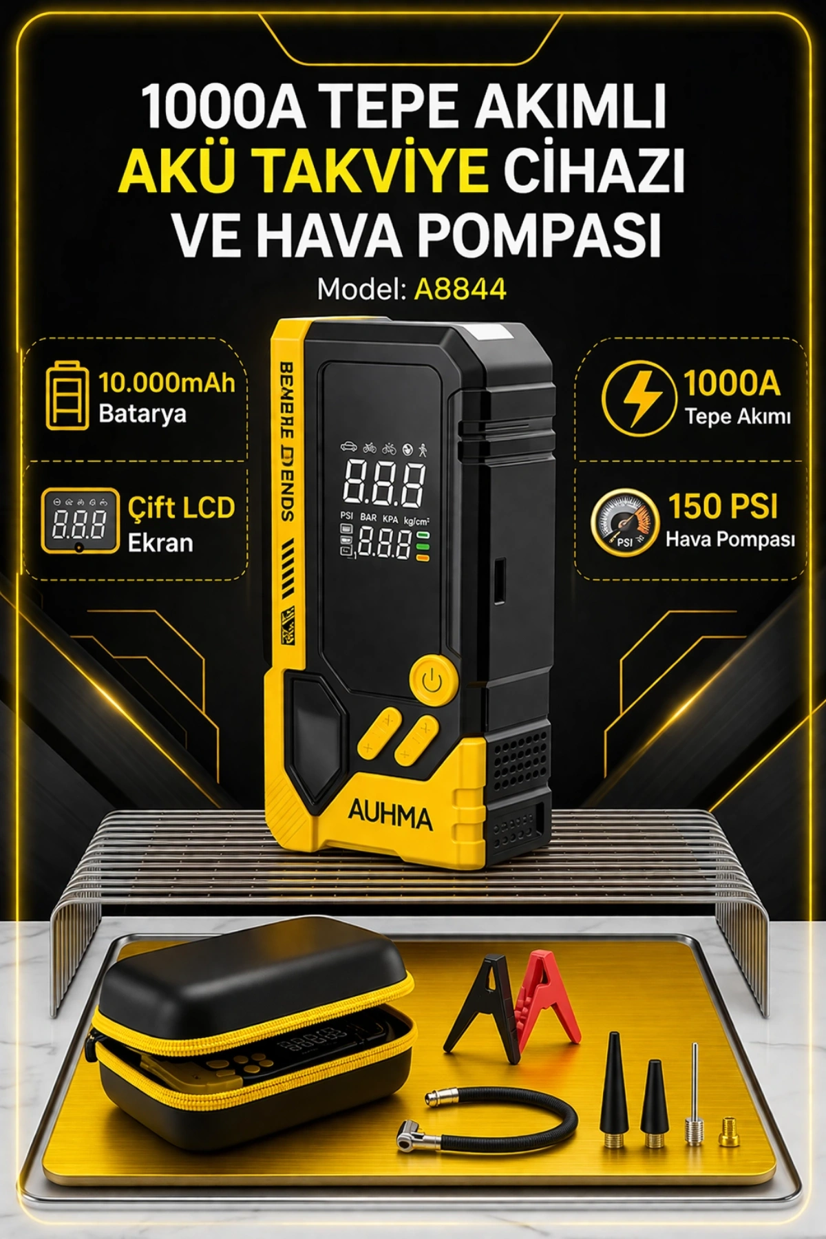 AUHMA A8844 ile yolda kalma riskine son verin! Hem güçlü bir akü takviye cihazı hem de akıllı bir hava pompası olan bu çok fonksiyonlu cihaz, her araç sahibinin bagajında bulunması gereken profesyonel bir yol yardım kitidir.