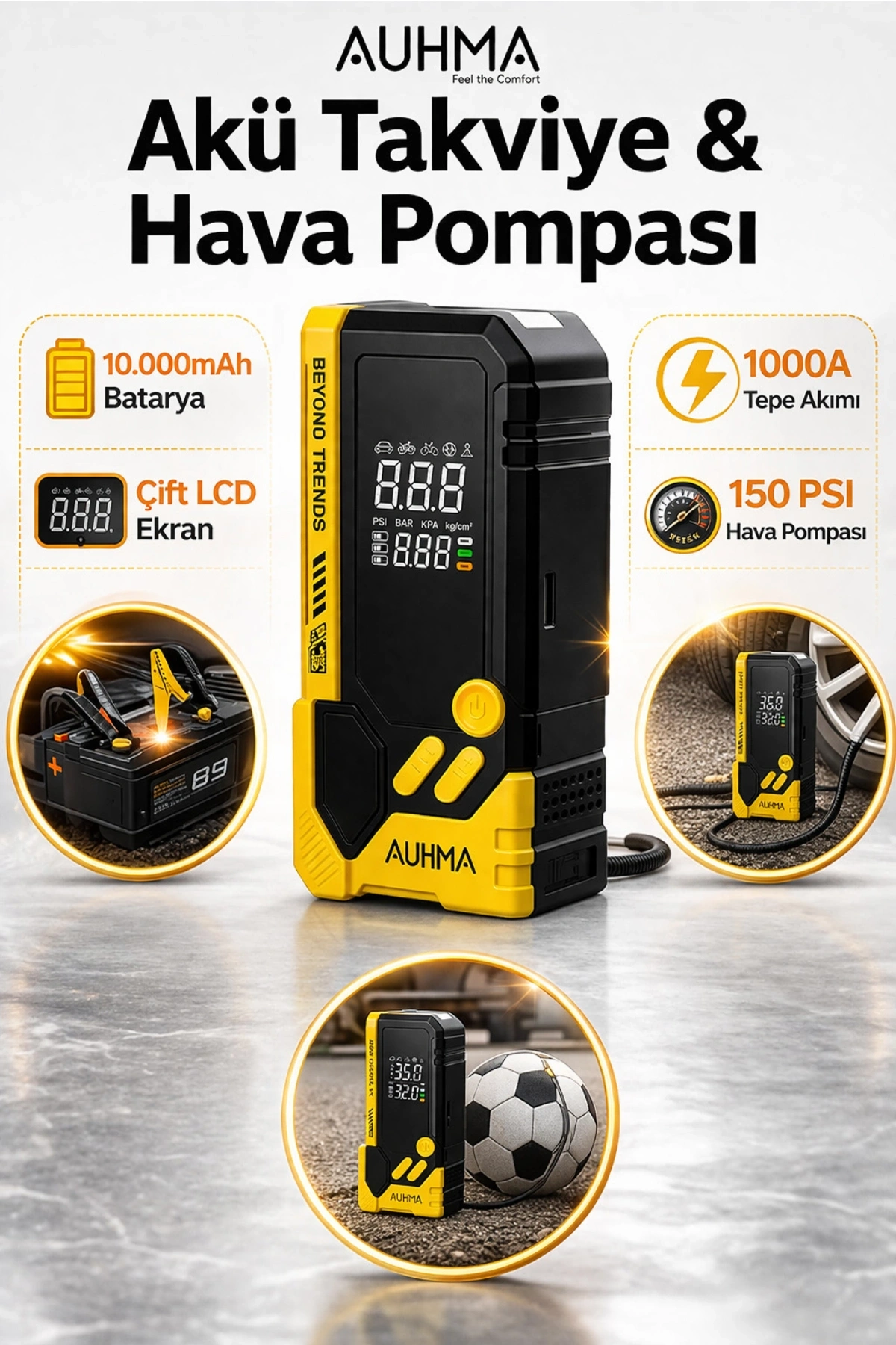 * Yüksek Performanslı Hava Kompresörü: Maksimum 150 PSI / 10.3 BAR basınç desteği sunar. 195/65/R15 bir araç lastiğini yaklaşık 7.5 dakikada tamamen şişirebilir.