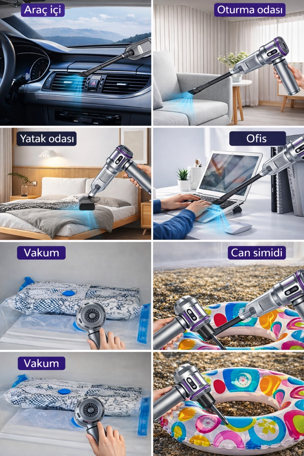 * Çift Fonksiyonlu Tasarım: Bir ucuyla güçlü vakum yaparken diğer ucuyla basınçlı hava üfleyerek çok yönlü temizlik sağlar.