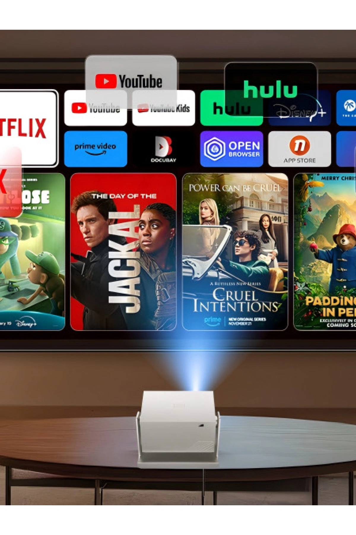 * Dev Ekran Deneyimi: 40 inçten 150 inç boyutuna kadar ayarlanabilir projeksiyon mesafesi ile duvarınızı dev bir ekrana çevirin.
