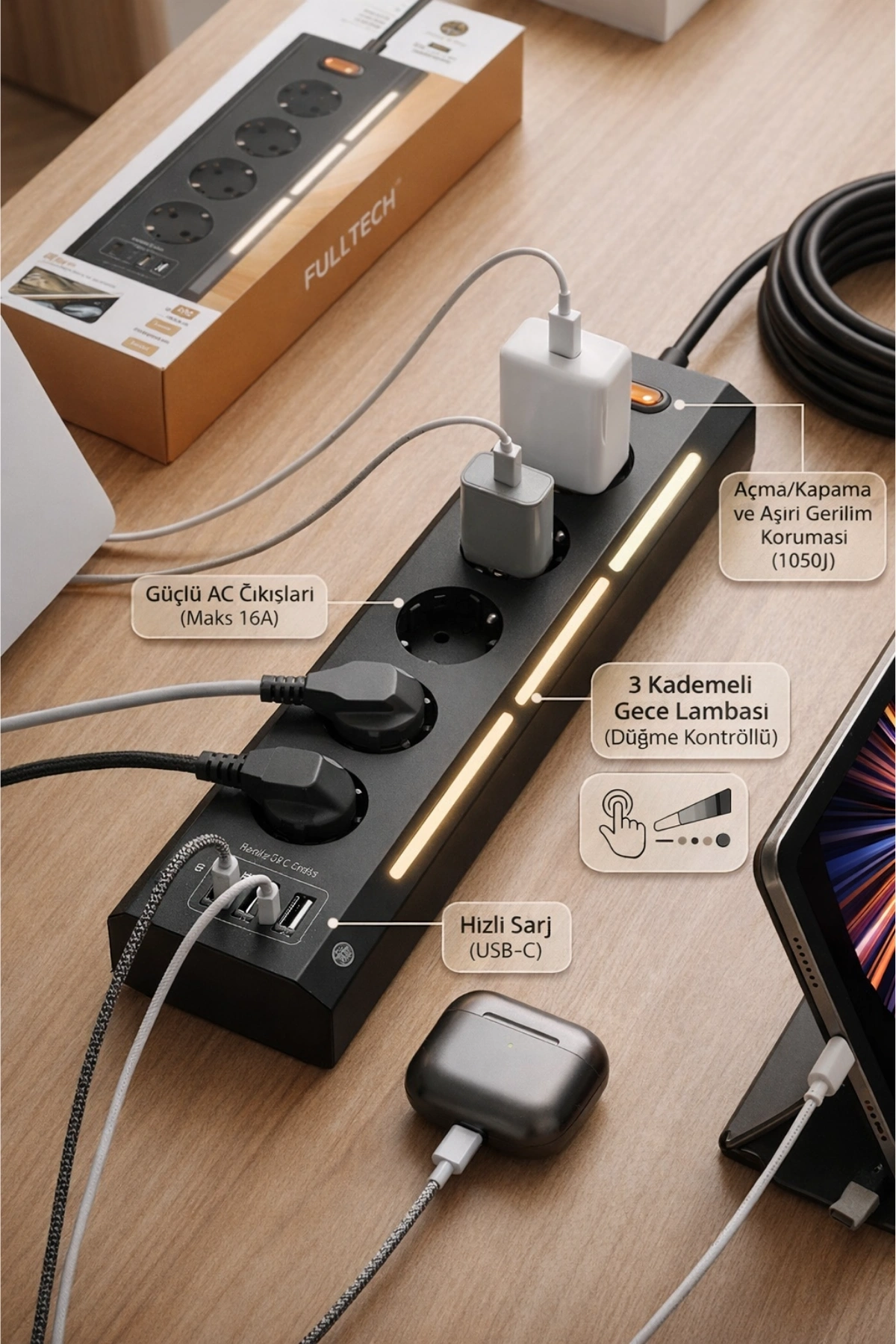 Ev ve ofis kullanımı için tasarlanan Fulltech FTR-26, karmaşık kablo görüntüsüne son verirken tüm cihazlarınızı güvenle şarj etmenizi sağlar. Modern tasarımı ve çok fonksiyonlu yapısıyla sadece bir priz değil, aynı zamanda şık bir masaüstü aksesuarıdır.