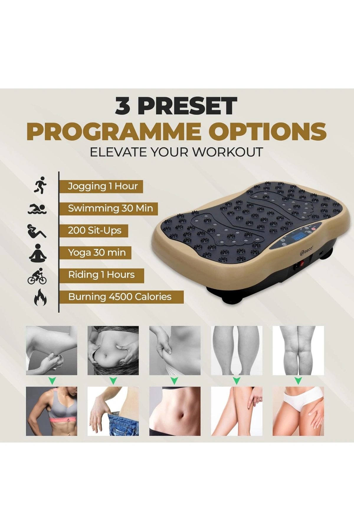 Etkili Zayıflama ve İncelme: Yüksek frekanslı titreşim teknolojisi, kasları hızla çalıştırarak daha kısa sürede kalori yakımını destekler ve özellikle karın, basen ve bacak bölgelerinde incelmeye yardımcı olur.