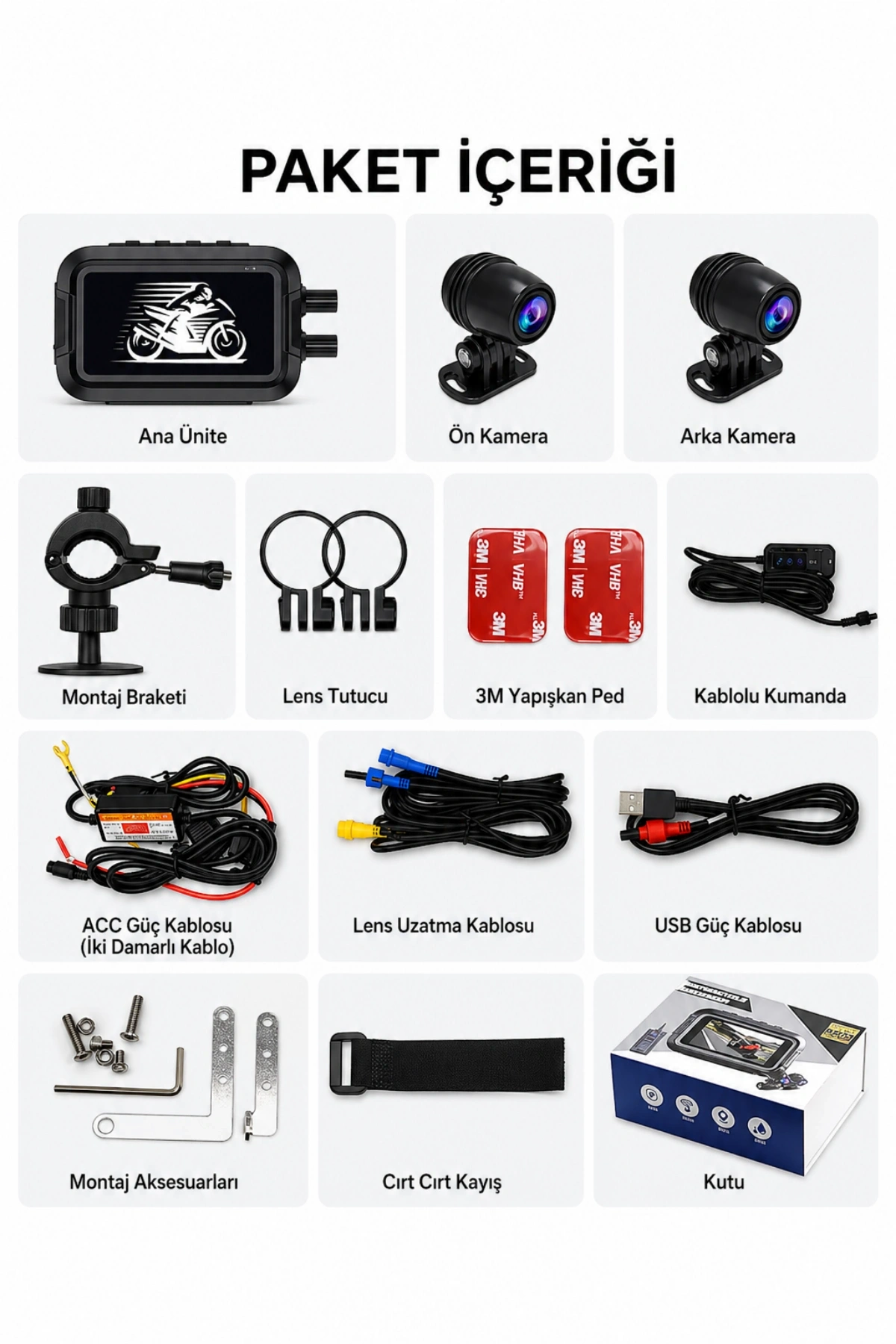 Kutu İçeriği: Ana ünite (IPS Ekran), 2 adet Full HD kamera, Uzaktan kumanda, Güç kabloları ve Montaj aparatları.