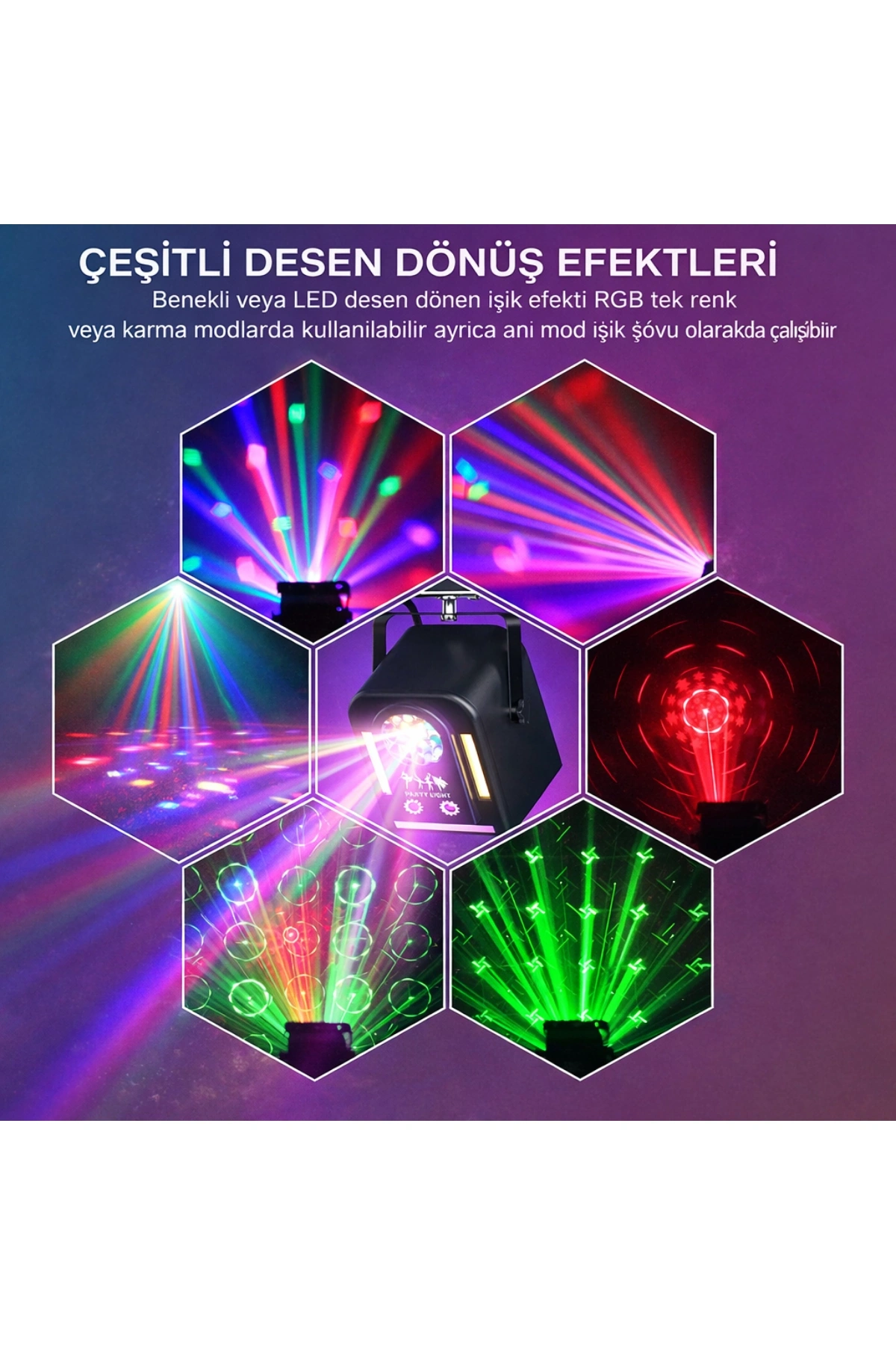 * Lazer Efektleri: Güçlü 1 adet kırmızı ve 1 adet yeşil lazer çıkışı ile keskin ve net ışık huzmeleri sağlar.