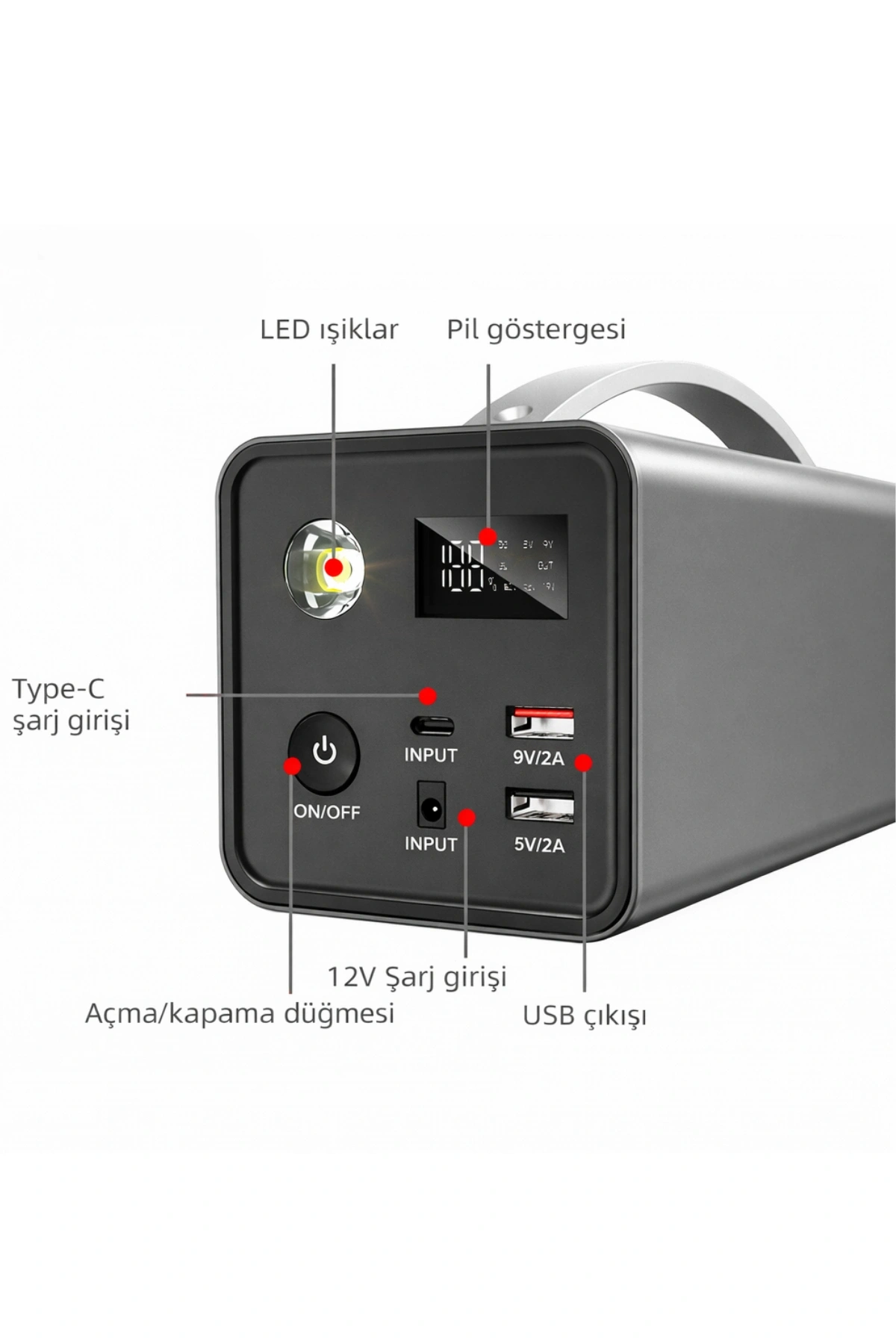 * Çok Yönlü Çıkış Gücü: Üzerinde bulunan 220V AC ev tipi priz sayesinde küçük ev aletlerinizi çalıştırabilir, Type-C ve USB portları ile telefon, tablet ve dizüstü bilgisayarlarınızı hızlıca şarj edebilirsiniz.