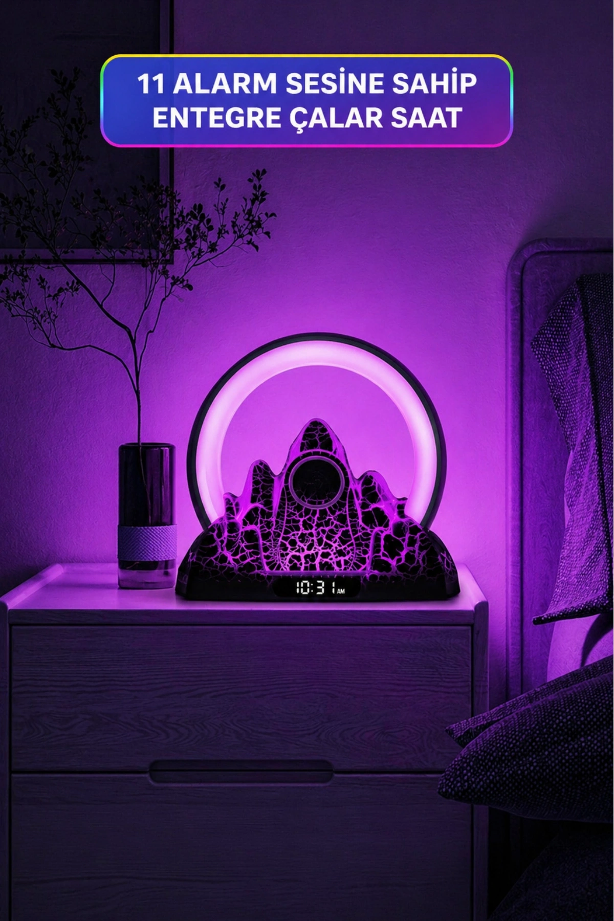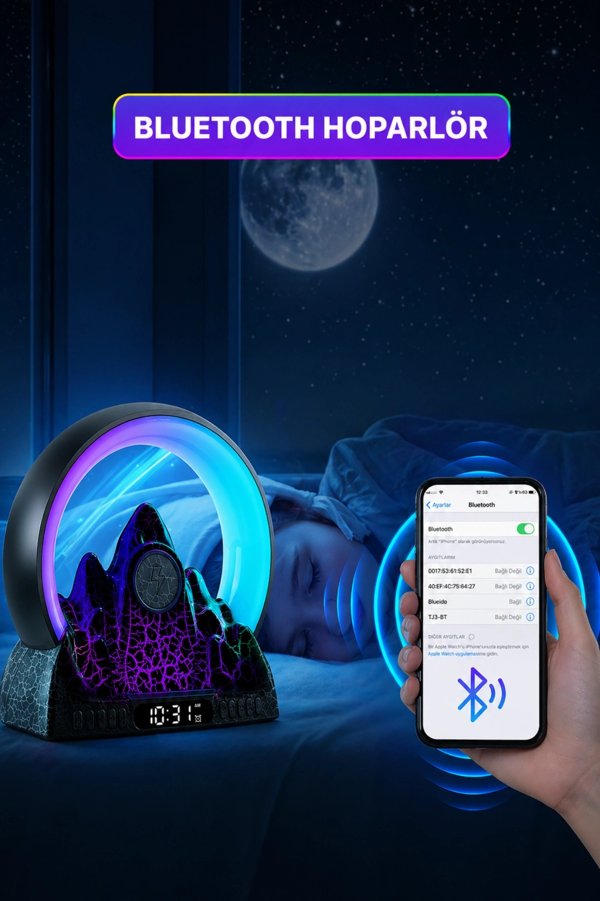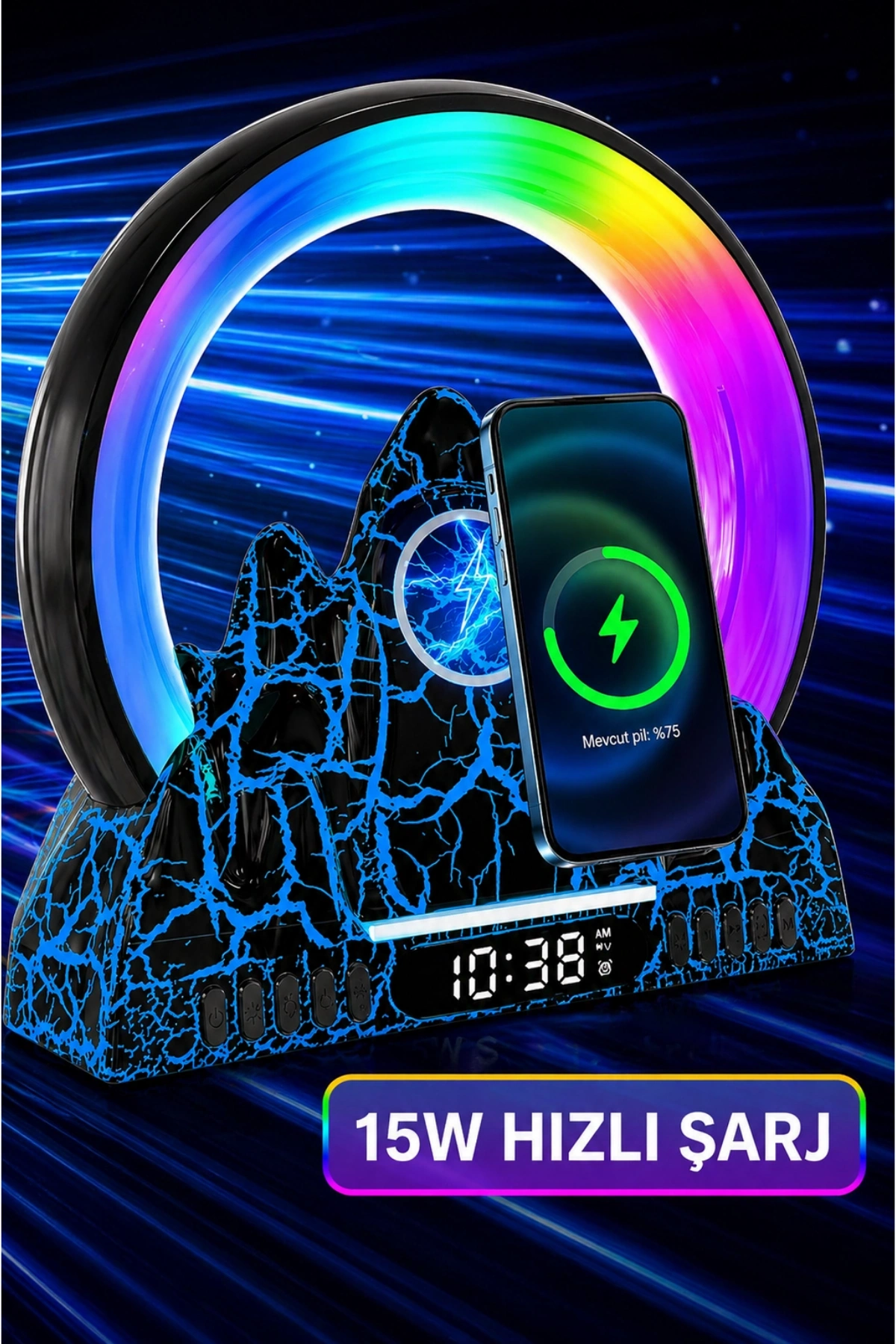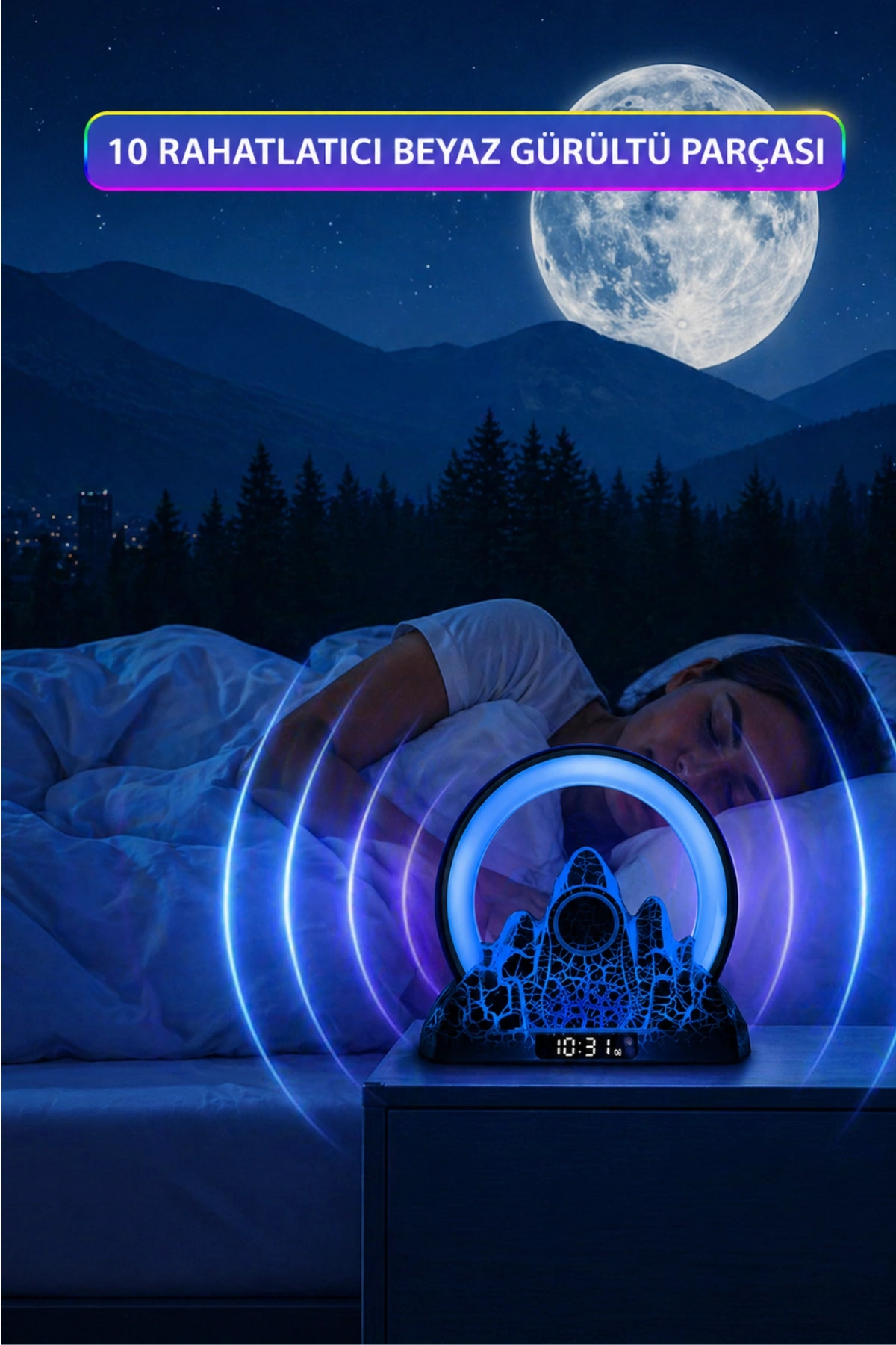 * 7'si 1 Arada Fonksiyon: RGB Aydınlatma, Bluetooth Hoparlör, 15W Hızlı Kablosuz Şarj, FM Radyo, Dijital Saat, Alarm ve Uyku Modu (Beyaz Gürültü/Rahatlatıcı Müzikler).
