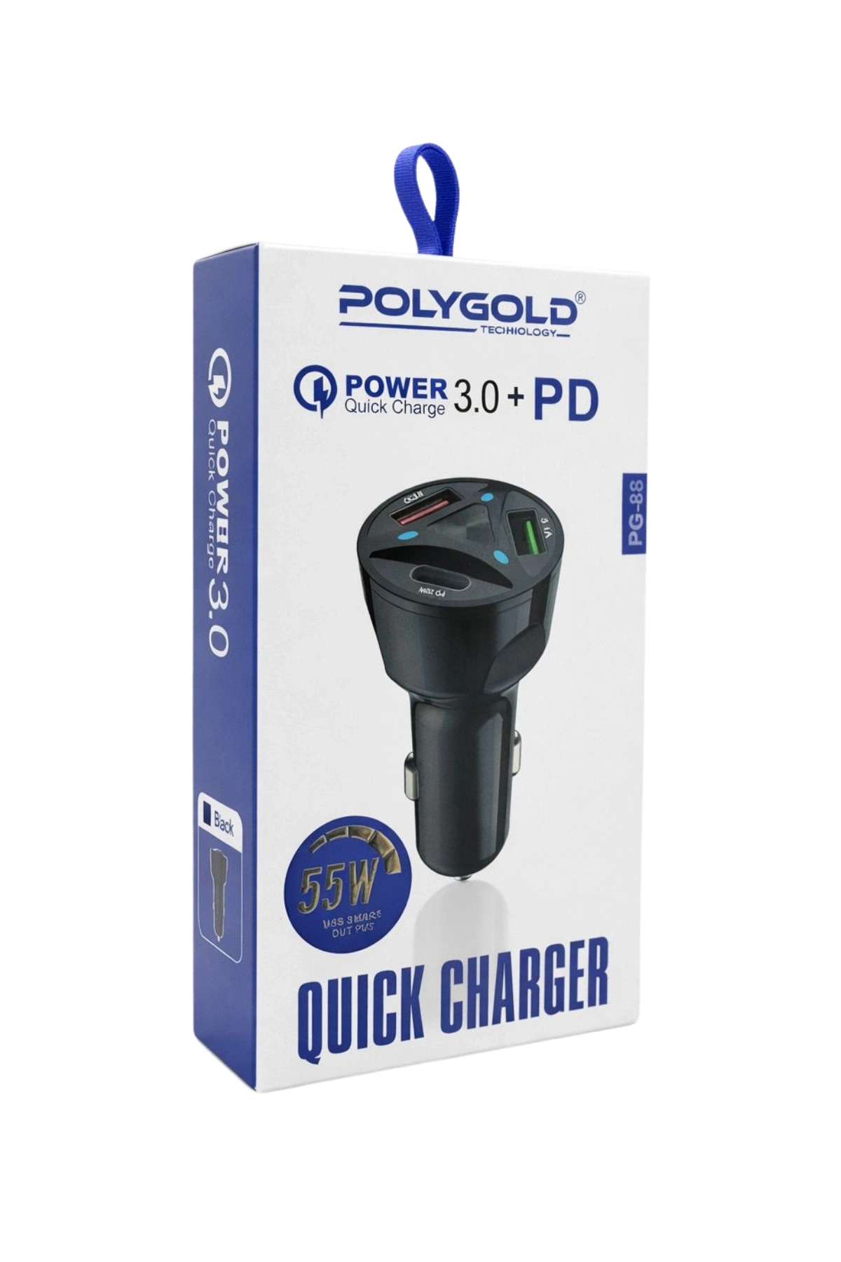 Polygold araç şarjı, 55W araç şarj cihazı, hızlı araç şarjı, PD araç şarjı, QC 3.0 araç şarjı, Type-C araç şarjı, PG-88 araç şarj başlığı, oto şarj aleti.