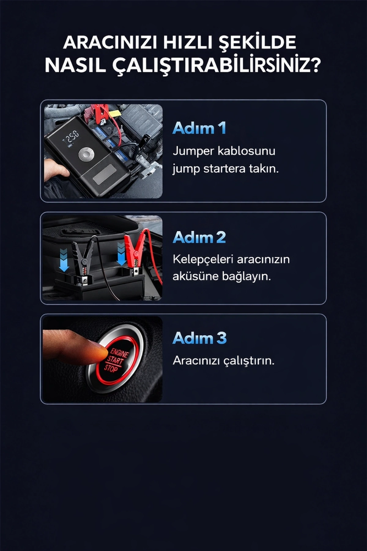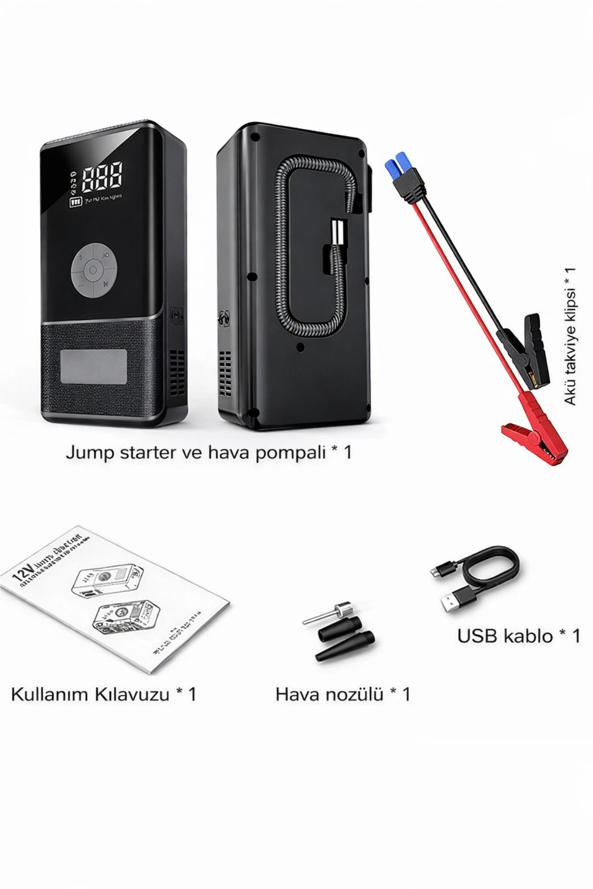 Güçlü Jump Starter özelliği, 12V araçlar için hızlı ve güvenli bir takviye sağlar.