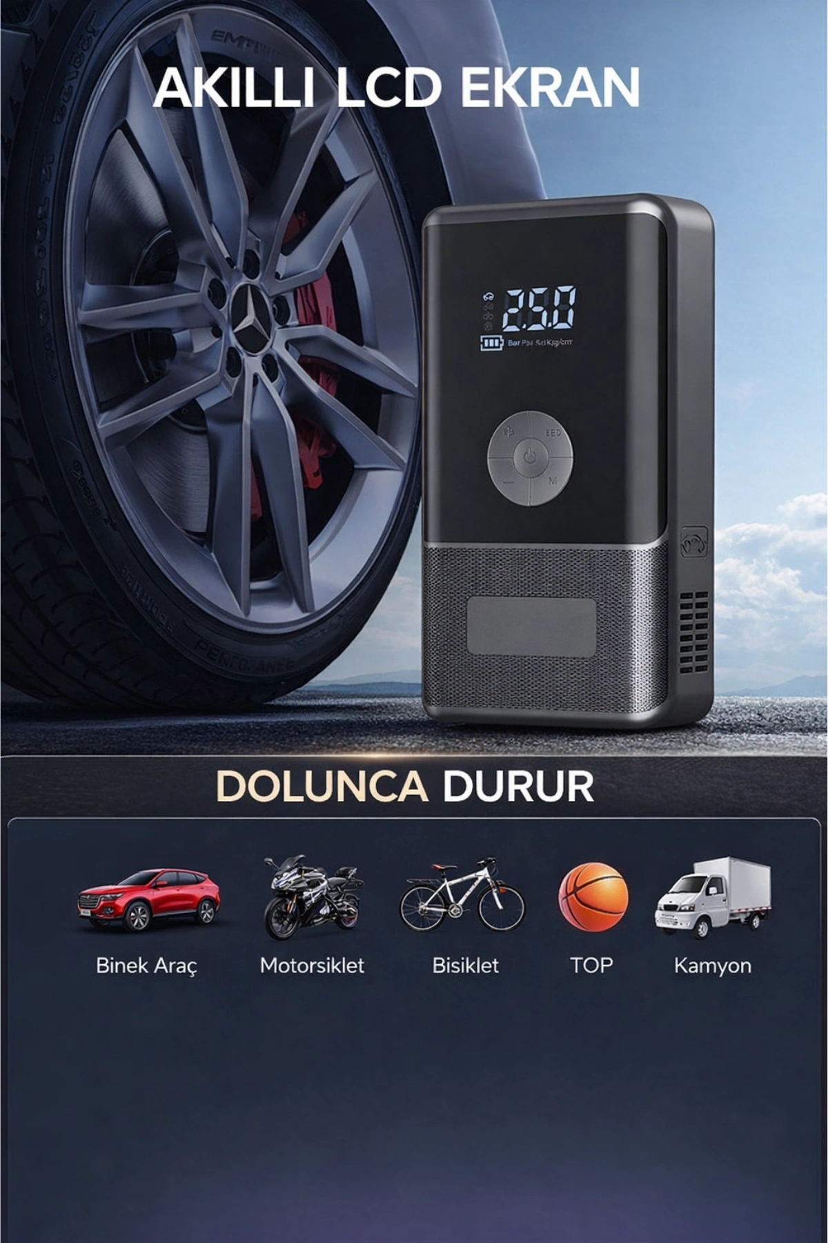 Akıllı durdurma özelliği sayesinde aşırı şişirme riskini önler. Sadece otomobil lastikleri değil; motosiklet, bisiklet ve toplar için de ideal bir yardımcıdır.