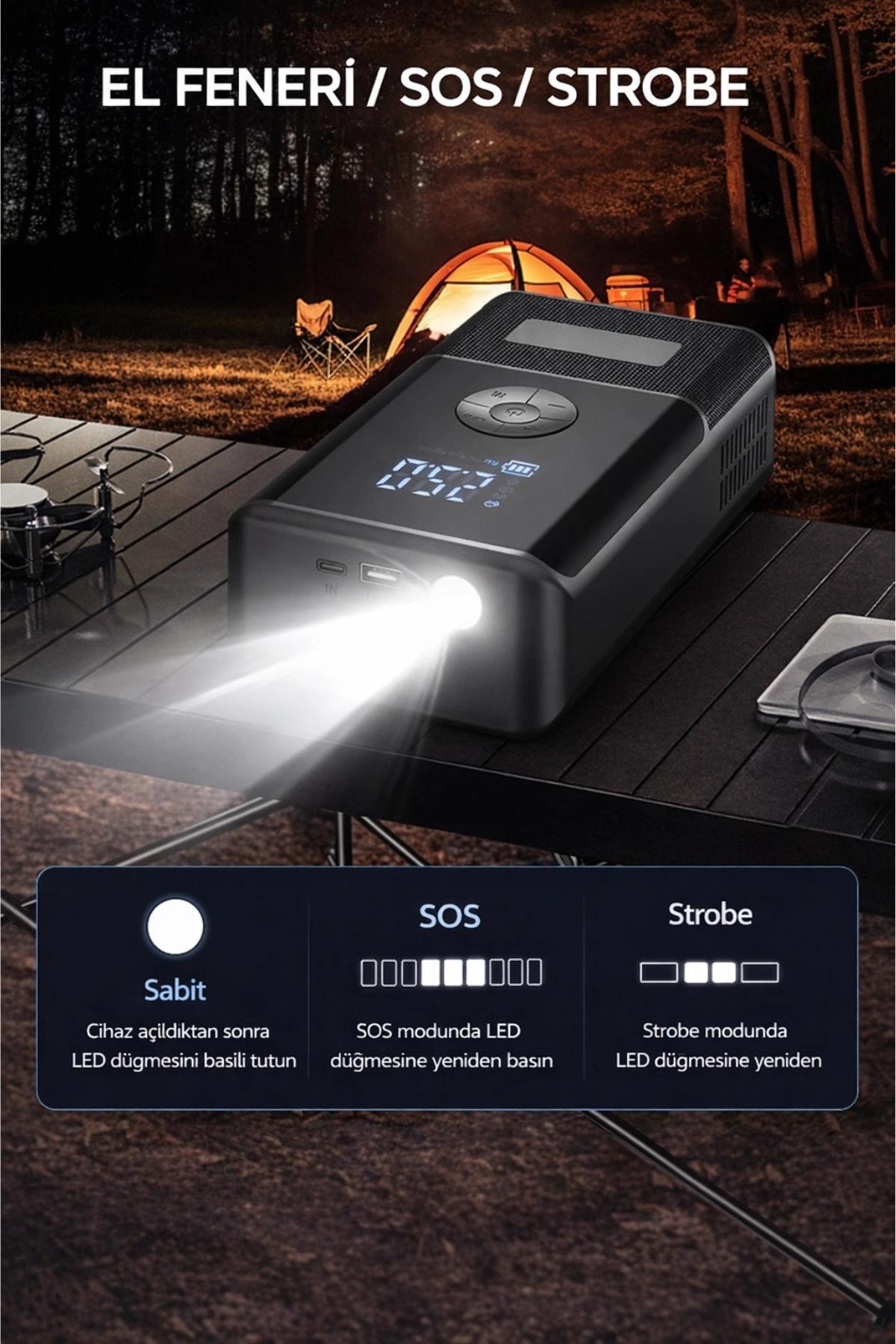 * 4'ü 1 Arada: Akü Takviye + Hava Kompresörü + Powerbank + LED Fener.
